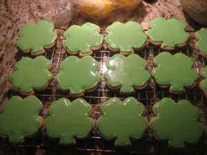 Over on Annie’s Eats, Annie decorates these cookies for every holiday and event you can think of: Christmas, Valentine’s Day, Halloween, Baby Showers, Weddings, Housewarmings etc. Danielle and I have been obsessing over these cookies for the longest time. She actually made them at Christmastime, and they looked amazing! I was amped to try them out around Valentine’s Day, and got all the supplies, but with the Elimination Challenge, I wasn’t really up for it. So St. Patrick’s Day Cookies it is!
