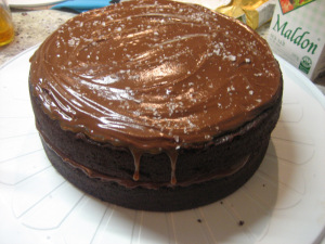 This cake consists of three layers of chocolate cake, salted caramel between each layer, and a chocolate caramel ganache frosting. I busted out the big guns for this cake, and walked down to St. Lawrence Market at lunch one day to pick up some Valrhona cocoa powder and Callebaut chocolate. It’s definitely a labour-intensive project - you actually have to make caramel twice, once for the filling and again to add to the ganache frosting - and I had chocolate all over the wall, counter and floor in my kitchen when it was all done.
