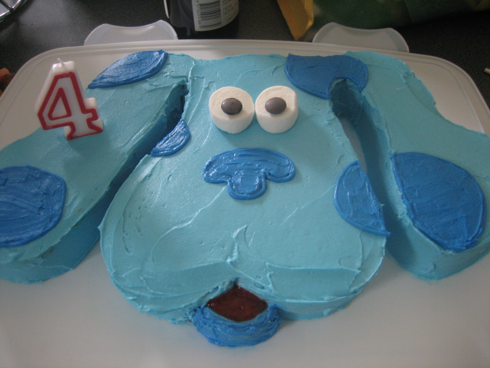 So like the school bus, and the bowling pin, I traced my 9×13 cake pan onto a piece of paper. Then I opened google images to Blue’s Clues, and used my (limited) drawing ability to copy an outline of Blue onto the paper. When I was happy with what I had (and my counter was covered with little eraser bits), I cut out the shape, placed it on to the cold cake, and carved it out. I needed Blue to be a little bit longer, so about half of his ear on the right is carved out of scraps from the other areas. By the time you get the icing on, no one will know the difference!