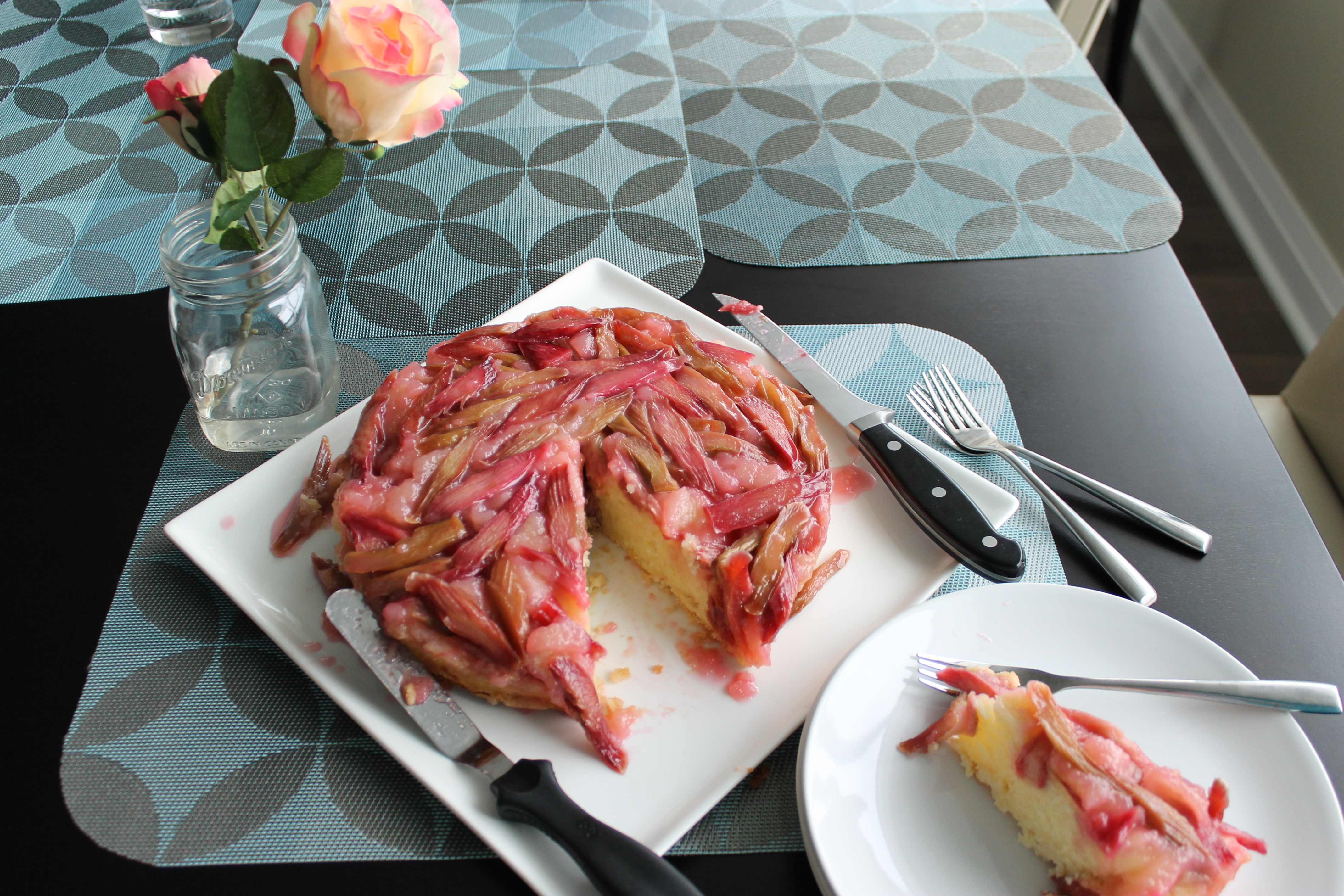 - Add the rhubarb to the pan, and spread out evenly. Pour the cake batter overtop, and spread evenly over the rhubarb. Bake the cake for 1 hour, until a toothpick inserted into the centre comes out clean. Let the cake cool in the pan for 10 minutes, then invert onto a plate or platter.