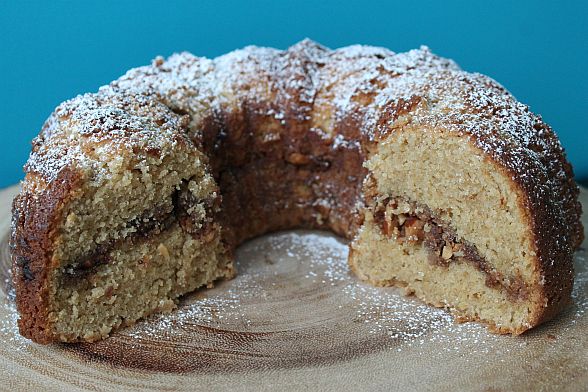 This Toffee Coffee Cake has a filling “burrowed” (get it?) in the middle, which is made up of chopped Skor bars and toasted almonds. The cake itself is nice and hydrated due to a heap of sour cream in the batter. The method for making the cake was a little odd to me, as you first mix together the butter, flour, sugars and vanilla, before adding the eggs and then the sour cream. The batter is quite thick, and I kept checking the recipe to make sure I wasn’t supposed to add milk at some point.