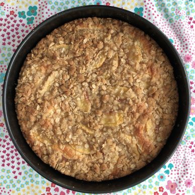 - For the topping, stir the flour, brown sugar and oats together in a small bowl, and cut in the butter with a pastry cutter or a fork until crumbly. Stick in the fridge while you make the cake.