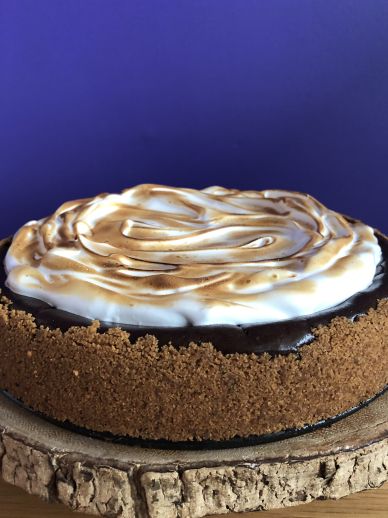 - Spoon this fluffy goodness onto the top of the cheesecake, and spread around making nice swoops with an offset spatula. Using a kitchen torch, toast the marshmallow lightly until golden brown.