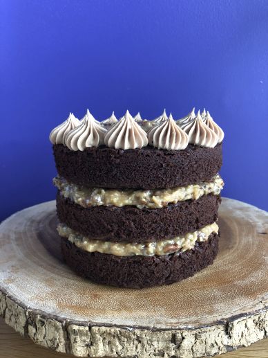 What’s a German Chocolate Cake you ask? It’s a chocolate layer cake stacked up with a coconut-pecan-brown sugar filling. Some versions also have a chocolate frosting covering the entire thing, but the Baked Boys are leaving the sides of their cake naked, with a border of icing piped just around the top. I didn’t really have any expectations for this cake, but I ended up being OBSESSED with it, and here’s why: THE FILLING TASTES LIKE HELLO DOLLIES!!! My favourite treat of all time, in cake formation? YES PLEASE! (I’m already brainstorming how I can use this filling to create a Hello Dolly cupcake!)