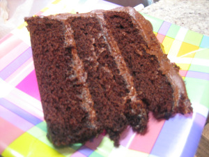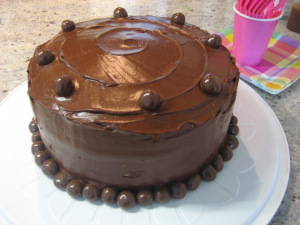 The cake itself is rich and chocolatey, the exact opposite of what a boxed chocolate cake mix tastes like (which is nothing). The icing is richer than rich, and I might even say too rich for me. I don’t think I whipped it enough either, but when there’s *spoiler alert* a pound each of butter and chocolate involved, I don’t think fluffiness is on anyone’s mind! I decorated the cake with chocolate covered caramels which I picked up at Bulk Barn, and it was a delicious first course at my 1st blog-iversary party. Yeah that’s right, first course.