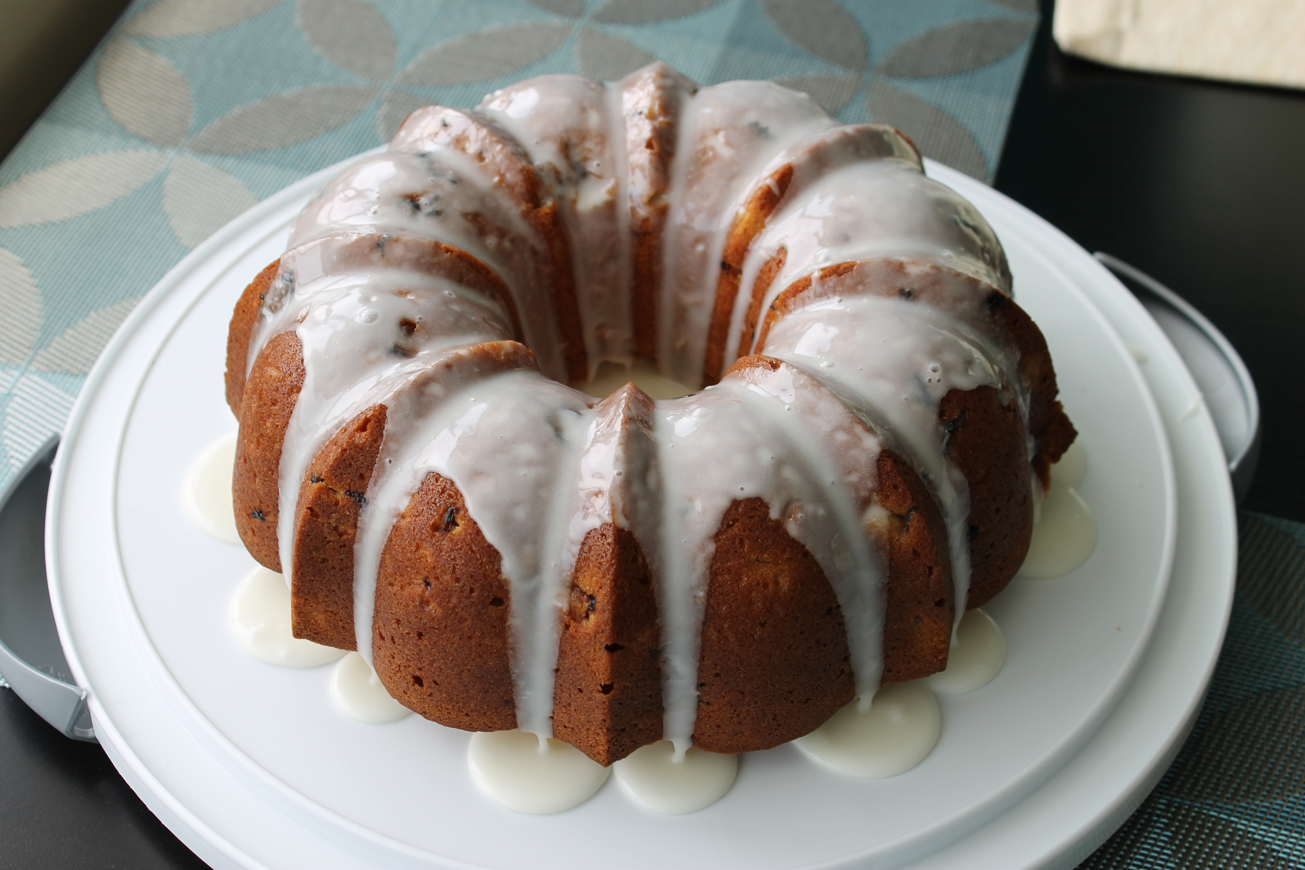 - Make the glaze by whisking the icing sugar, lemon juice and butter together, and pour it over the warm cake. (A lot of glaze will run off and collect at the bottom, but people will just stick their fingers in it or spoon it off onto their cake). Make this while you still have the chance!