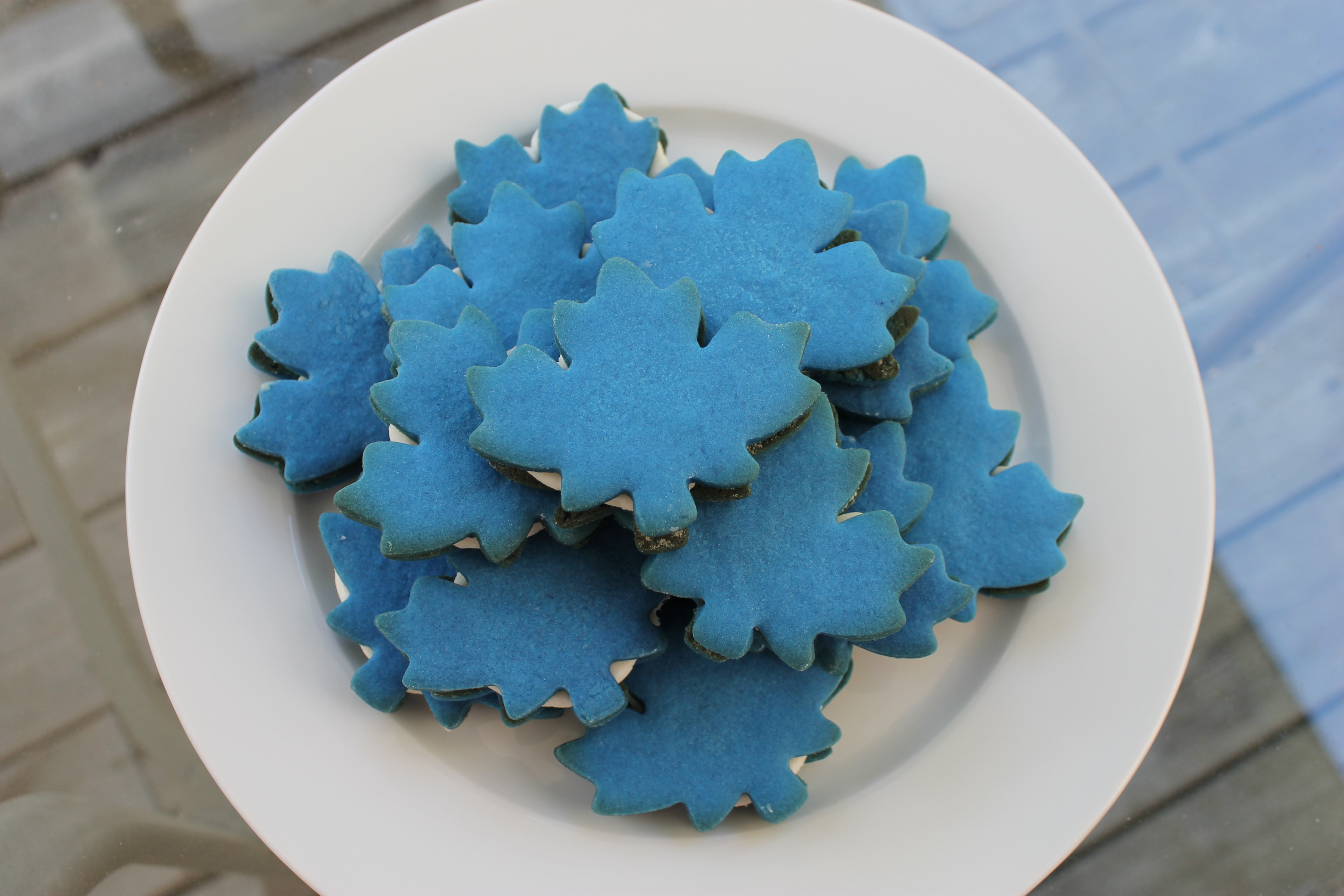 My not-so-little nephew turned SEVEN last week, and he requested Toronto Maple Leafs cookies for his family party. I knew I wasn’t going to have enough time during the week to go the whole royal icing route, so my brainstorm was to make the actual cookies bright blue and sandwich them together with faux-Oreo filling. Success!
