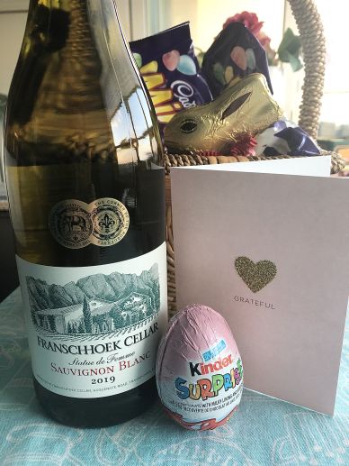 - The best Easter Bunny (my friend Sarah) dropped off some treats for me: a lovely bottle of wine she had shipped back from South Africa (where she was travelling before having to come home) and a Kinder egg. Loved it!